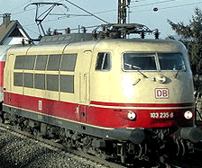 Für das internationale Schnellbahnnetz ( TEE - Trans Europ Express) entwickelte die Deutsche Bundesbahn eine völlig neue Hochleistungslokomotive, die E03. Sie wurde 1965 auf der Internationalen Verkehrsausstellung in München erstmalig präsentiert. Die sechsachsige Maschine wog 110t und mit einer Dauerleistung von 6.000kW war sie für eine maximale Geschwindigkeit von 200 km/h ausgelegt. Für Versuchsfahrten legte man Bremsen und Sicherheitsausrüstung für eine Geschwindigkeit von bis zu 250 km/h aus. Als Einsatzgebiet war neben den TEE-Zügen auch das neue InterCity-System vorgesehen. Die rot/beige Farbgebung der E03 war auch das Markenzeichen dieser schnellen innerdeutschen Verbindungen. 1970 begann nach mehrjährigem Versuchsbetrieb die Serienlieferung als Baureihe 103. Diese überarbeiteten Maschinen erreichten eine Dauerleistung von 7.500 kW. Im Kurzzeitbetrieb waren bis zu 10.000 kW möglich. Die Vorserienloks dienten weiterhin als Versuchsträger für die ersten ICE-Züge ( Bahndienstloks BR 750). Viele Komponenten der neuen Hochgeschwindigkeitszüge und der Neubaustrecken wurden mit diesen Maschinen getestet. 145 Serienmaschinen wurden gebaut und waren bis in die 80er Jahre im IC und TEE-Verkehr eingesetzt. Sie erreichten Laufleistungen von bis zu 30.000 km im Monat. Im Rahmen der Umstrukturierung des Bahnkonzeptes wurden die 103er später auch immer mehr im allgemeinen Schnellzugverkehr eingesetzt. Seit dem Jahrtausendwechsel werden immer mehr 103er durch die neue Baureihe 101 abgelöst. |